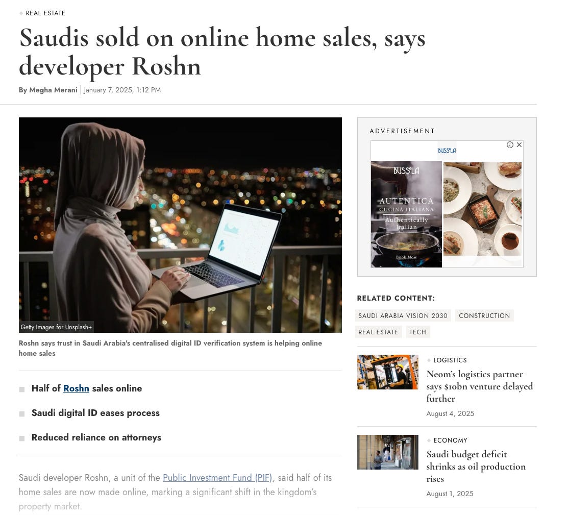 Last month, I was on a Teams call with a Saudi family office principal. "Western developers keep showing us the same luxury projects," he said, scrolling through his phone. "But look at this." He showed me ROSHN's app - 50% of their home sales now happen entirely online. No site visits. No lengthy negotiations. Just click, buy, done.